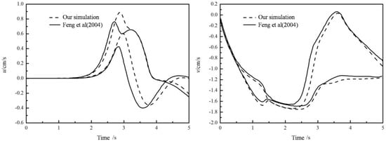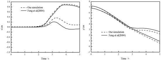 The time histories of position and velocity of the two particles are shown in Figure 2 and Figure 3. The drafting process is before 1.0 s, and kissing process is from 1.0 s to 2.5 s, and tumbling process is from 2.5 s to 3.5 s. The results from the present method and Feng et al. [] match very well before kissing while after tumbling some deviation shows up. The DKT process is a nonlinear instability problem and the tumbling process is very sensitive to numerical methods adopted, causing errors between different algorithms []. The reproduction of the DKT process and the comparison between the results demonstrate the validation of the presented coupled LBM-DEM procedure in Newtonian fluid.