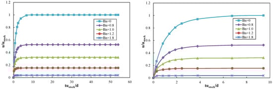 From Figure 4, when Bn = 0, the fluid is equivalent to a Newtonian fluid, the circular particle will reach the Stokes’ velocity. This validates the coupled algorithm from another perspective. As Bn increases, the terminal velocity drops down, dragged by the escalating yield stress. It takes less time to reach the highest velocity as the Bn increases. In a Bingham fluid, a particle has to overcome not only the viscous force, but also a resistance due to the yield stress. Such resistance from yield stress consumes parts of the potential energy from the gravity. And the more potential energy consumed, the less time is required to reach the final velocity and smaller terminal speed can be achieved.