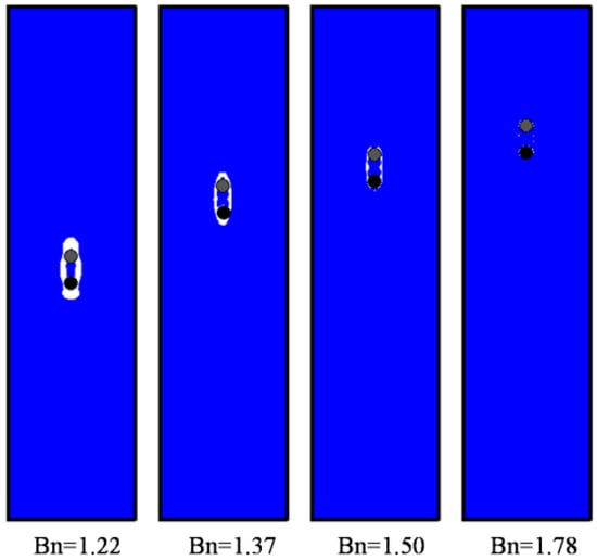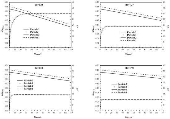 Then, sedimentation of two circular particles in the Bingham fluid are simulated, as shown in Figure 5, Figure 6 and Figure 7. The standard DKT process can be observed when Bn is small, similar in Figure 1, which validates the coupling of the LBM-DEMB in Bingham fluid. The snapshots at the kissing time of the sedimentation processes with different Bingham numbers are shown in Figure 5. The position where the two falling particles kiss is lower and the time needed increases if the Bn becomes larger. When the Bn is larger enough, the top particle (particle 1) will never catch up with the bottom one (particle 2). They fall at the same velocity and their distance remains constant, as shown in Figure 7. Different from Newtonian fluid, the DKT process disappears in Bingham fluid, as shown in Figure 5 and Figure 6. Additionally, the final speeds of the two particles decrease as Bn increases. The distances the two particles travel will be shortened.