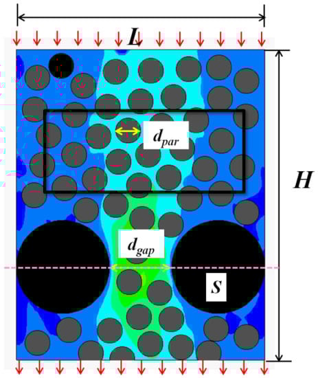The two-phase Bingham flow through a single channel is modeled with the coupled LBM-DEM framework and the impact factors of the passing ability of two-phase Bingham flow are studied. The simulation layout is shown in Figure 8. L = 80, H = 100 (all dimensions are in lattice units). For simplicity, circular particles are used to represent coarse aggregates in SCC, whose diameter dparticle = 8. Pressure periodic boundary condition is applied in both the upper and bottom boundaries while halfway bounce-back boundary condition is used in the vertical walls. The larger particles are fixed whose diameters varied to create different gaps. In terms of parameters in Papanastasiou’s model, plastic viscosity μp = 0.4, yield stress τ0 = 2.0 × 10−6, the power index m = 1 × 108. The passing ability of two-phase Bingham fluid-particle flow in a single channel is related to the pressure gradient, the volume fraction of solid particles and the width of the gap. For convenience, three dimensionless parameters are defined as follows Equations (11)–(13):