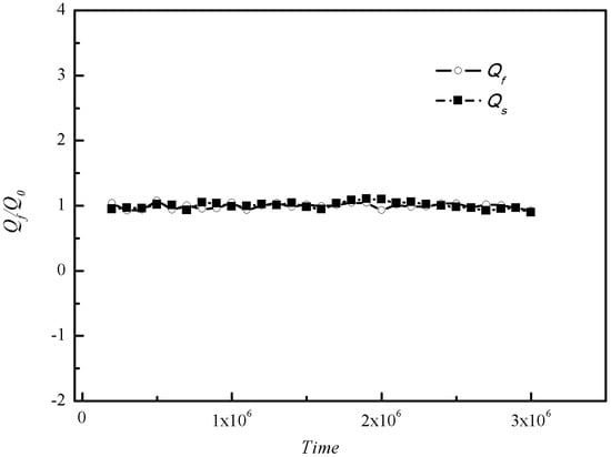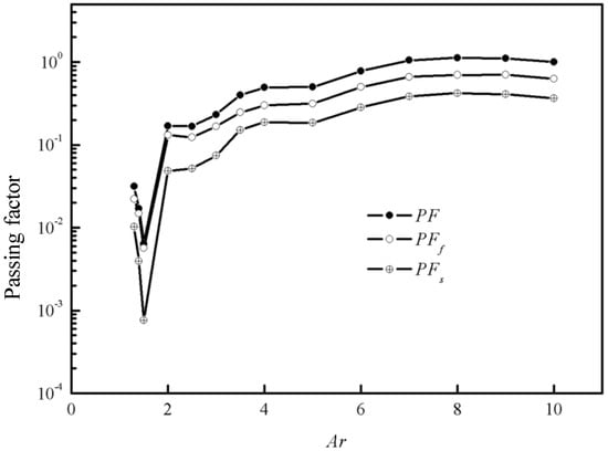where, PFs and PFf are passing factors of solid particles and fluid, Qs0 and Qf0 are fluxes of particles and fluid through cross section S when there is no fixed particle, while Qs and Qf are fluxes of particles and fluid through cross section S with different Ar. The passing ability of two-phase flow is excellent and no jamming of moving particles occurs when PF = 1. However, the risk of jamming will increase with PF decreasing while jamming of particles will definitely emerge when PF ≈ 0. In order to eliminate the deviation, the fluxes of particles and fluid are calculated every 105 time steps and the total time steps are 3 × 106, the average value of the 30 results is used as the final average fluxes of particles and fluid. The simulation result when Ar = 8 is shown in Figure 9.