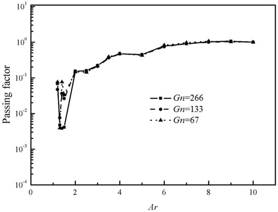 In total, 135 cases were simulated with Ar = 1.3~10, ϕs = 0.46, 0.35, 0.25, and Gn = 67,133,266, respectively. The passing factor of the Bingham fluid-solid flow in every case is calculated and presented in Figure 10. It can be seen that Ar is the predominant parameter that has an important influence on the passing ability and the passing factor suffers a sharp decrease when Ar < 2 for all cases, which is in accordance with results in Martys []. When Ar is close to 1, the passing factor increases to a certain extent, because the arch structure is difficult to form when the gap is too narrow. Pressure gradient has little effect on the jamming status of Bingham fluid-solid flow.