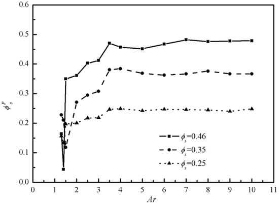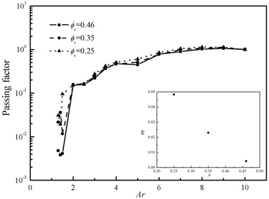 The passing factors versus Ar with same pressure gradient Gn but different ϕs are shown in Figure 11. ϕs has an effect on the passing factor to a certain extent. The average passing factors when Ar < 2 for different ϕs are presented in the subgraphs of Figure 11. It is clearer from the Figure 11 that the passing factor decrease with increasing ϕs, which means it is more likely to jam with more particles.