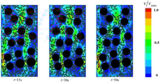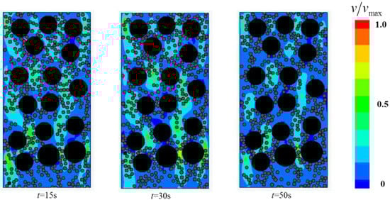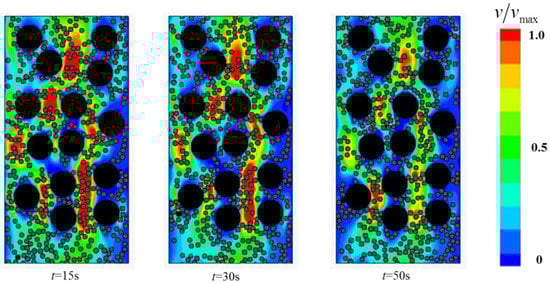 This section focuses on the two-phase Bingham flow in porous media. The solid fraction is set to ϕs = 0.46, while Gn = 166. A number of simulations were conducted for flows in porous media containing various narrow channels (Ar < 2). The flow fields at different times are shown in Figure 14, Figure 15 and Figure 16.