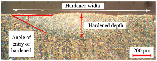 The pulse frequency was kept at 15 Hz. After LSTH, the samples from the medium of the hardening line were sectioned by wire cut EDM (electrical discharge machining). The samples were prepared with standard metallographic grinding and polishing techniques and etching to observe the microstructures with the following reagent: 2% Nital’s solution (ethanol 98%, nitric acid 2%) according to ASTM E 407. Leica MEF 4A optical microscopy (Leica Microsystems, 1700 Leider Lane, Buffalo Grove, IL, USA) with 50–100X magnification and the ImageJ software (LOCI, University of Wisconsin, Madison, WI, USA) was used for measuring the geometry features of the hardened case, i.e., width and depth of hardened case, angle of entry of hardened area; see Figure 1.