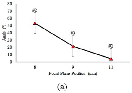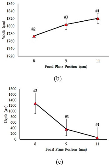 Influence of the focal plane position on LH (Laser Hardening Process) profile geometry. (a) Focal plane position on angle (samples #1, #2 and #3) (b) Focal plane position on width (samples #1, #2 and #3) (c) Focal plane position on depth (samples #1, #2 and #3).