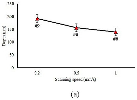 The input parameter effects on the hardened zone geometry are plotted in Figure 6, Figure 7 and Figure 8. The focal plane position had a direct effect on the width and a reverse effect on the depth and angle [37]. This phenomenon can be explained by analysis of the laser beam distribution displayed in Figure 5. In fact, by increasing the focal plane position (z distance in Figure 5), the laser beam transferred lower energy to the piece [38,39,40], which caused a wider and shallower hardened layer. While the width of the hardened layer increased and the depth decreased, the angle became smaller. Figure 7a–c account for the influence of LSS on the geometrical dimensions of the hardened layer. It consisted in the fact that the lower LSS caused wider and deeper case hardening with a bigger layer angle. That can be explained with LSS reduction, which increased the interaction time between the material and the laser beam. Therefore, more heat energy was transferred to the surface of the samples and wider and deeper hardened layers were achieved. Sample #9 had a deeper hardened layer, which was 193 µm, and 2284 µm width. Although samples #2 and #3 had the maximum depth and hardness, i.e., the surface of these samples was melted, they were not the best ones, while transformation hardening was desired. The melting surface was due to lower focal plane position distance (8 mm and 9 mm), which led to higher energy concentration and then the energy caused the melt of the material surface.