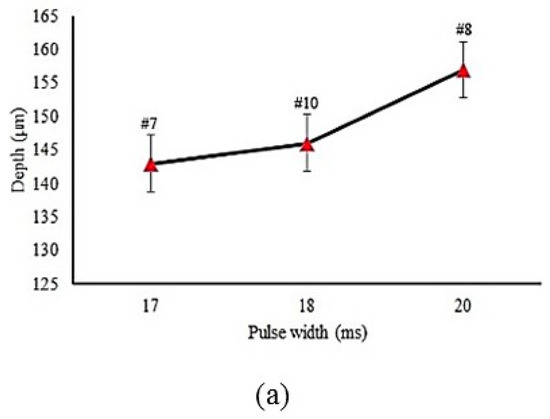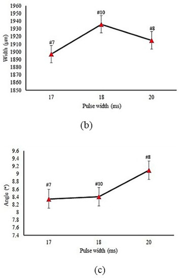 The influence of pulse width on the depth, width, and hardened layer angle is shown in Figure 8a–c, respectively. Increasing the pulse width led to increases in the depth and hardened layer angle. When the pulse width increased, the laser energy increased. Therefore, more heat was transmitted to the sample surface. This phenomenon caused a larger hardened area (see Equations (2) and (3)).