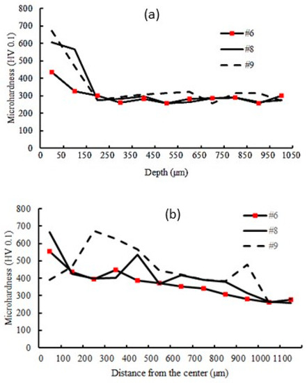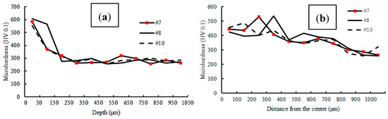 Micro-hardness profile in (a) depth and (b) width of the hardened laser layer (samples #7, #8, and #10); see Figure 2.
