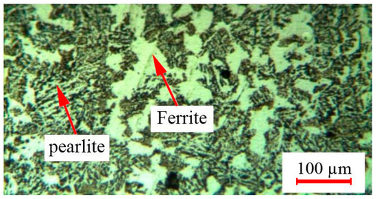 Figure 14 presents the microstructure image of the furnace heat treated sample cooled in oil. According to metallographic evaluation, the martensite phase in the furnace hardening quenched in the oil sample (Figure 14) was uniform and the base phases of AISI 4130 was ferrite–perlite. In addition, there was an unsolved ferrite phase.