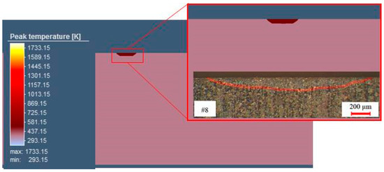 The calibration of the FEM model was achieved by comparing the micrographic cross section after the heat treatment. Figure 16 displays the comparison between the simulated and experimental hardened zone for sample #8. The geometry of the hardened zone was like that achieved in the laser surface transformation hardening.