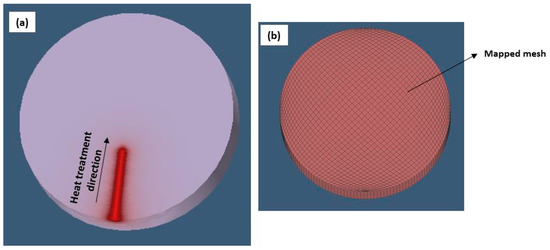 The temperature distribution in the hardening direction is shown in Figure 17a. During the simulation, the temperature reached about 1400 K by ensuring the phase transformation in the hardened region. Mesh size was essential to achieve the precision of the temperature distribution in the regions with high thermal gradients. The mesh used in the FEM simulation is shown in Figure 17b. The mapped mesh in the geometry had 12,800 volumetric elements and 1024 nodes. The mesh was applied uniformly in the sample volume.