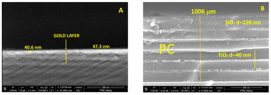 The structures of gold layer and PC were characterized by using scattering electron microscopy (SEM), dual beam Helios Nanolab 650 (FEI) (Oxford Instruments, Abingdon, UK). SEM studies of microstructure have shown that gold layer thickness on the glass substrate was about 43 nm, meanwhile PC consisted from six bilayers with TiO2 d = 40 nm and SiO2 d = 120 nm and 40 nm thickness of Ti2O layer on the top (Figure 1A,B).