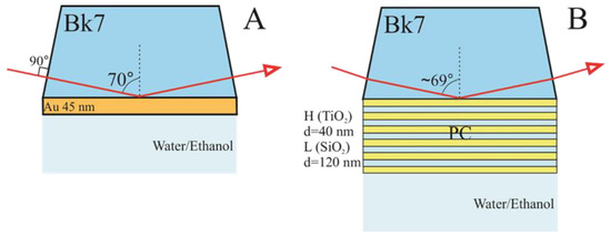 The structures supporting BSWs, distributed Bragg gratings were formed on the tops of the substrates (BK7 glass substrate), which had six bilayers of ~120 nm SiO2 and ~40 nm TiO2 and 40 nm of TiO2 layer on the top. For the excitation of BSWs the PC structure then was attached to the base of the BK7 prism through the optical contact as mentioned above. For both samples with the supported BSW and SPP modes, the experiments were conducted in a TIRE configuration. These used a glass BK7 prism (70°) at AOI of 70° (Figure 2A) for SPP and 68° (Figure 2B) for BSW. In case of BSW excitation optical scheme, the angle of incidence was 68° for better optimization of resonance. So, according to Snell’s law the internal angle of incidence in the prism was about 69.3°. The liquid handling system with a custom-built Teflon chamber was used in which the surfaces of both samples of SPP and BSW were placed. The chamber was filled with deionized water, which as then changed to ethanol, whose refractive index is higher than water.