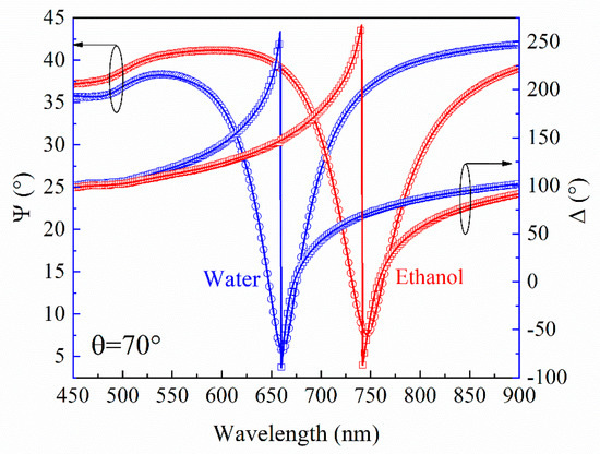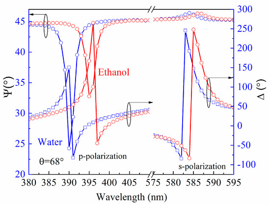 Meanwhile for the BSW, the shift in the spectra was significantly smaller, 4 nm up to 394 nm for TM-polarization and 2 nm up to 586 nm for TE-polarization. The predicted behavior of the optical responses of both excitations was determined by the changes of the refractive index from pure water to ethanol. As can be seen from Figure 3 and Figure 4, the changes in the ellipsometric parameters Ψ and Δ due to the increase of the refractive index of the semi-infinite medium were δΨ = 33.8°, δΔ = 201.6° in the SPR case, while for the BSW case, these values were δΨ = 22°, δΔ = 167°, δΨ = 0.45°, δΔ = 77.2° for the TM- and TE-polarizations, respectively. The deionized water and ethanol dispersions of the refractive indexes were evaluated from the TIRE measurements where the prism was connected with the chamber for liquid handling and further, from the regression analysis. The Cauchy function was used for the refractive index dispersion of the semi-infinite medium and the optical constants were very close to those, which are found in the literature [26,27]. Further, the optical constants of the materials being used, namely the BK7 [28], were SiO2 [29], TiO2 [30] and Au [31].