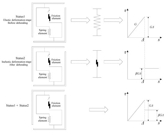 It is assumed that when external load is applied on the interface, the spring element initially undergoes an elastic deformation process, and then breaks (debonding) when the deformation reaches its fracture threshold. As a result, the friction element then experiences a slipping process, which represents the friction between the rebar and concrete. A switch element was also introduced for controlling the work of the spring element and friction element. During the elastic deformation process, the switch element is in opening state, which reveals that the friction element was isolated. After the failure of the spring element, the switch element was closed and caused the friction element began to slide. Therefore, the entire response of the interface are able to be characterized when subject to external loading. Physically, it is worthy of note that such a switch element is not a mechanical element and the aim for introducing it is only for purpose of demonstrating the transformation process from debonding to the frictional sliding in microscopic scale.