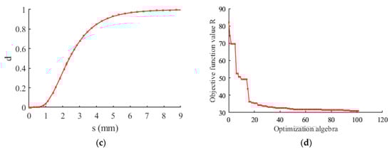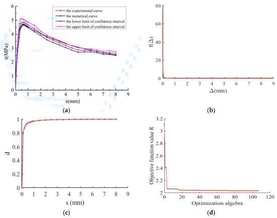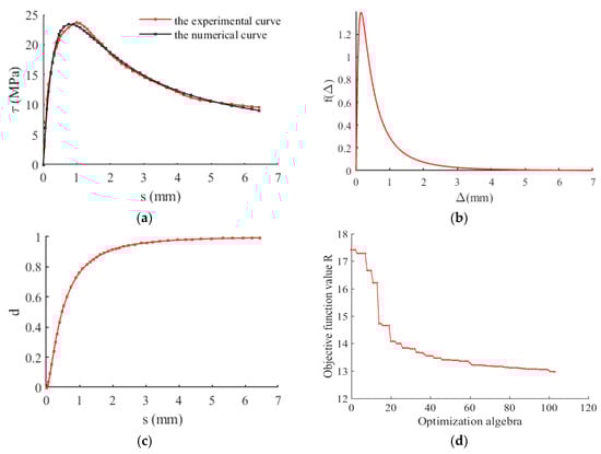 Bond stress-slip behavior in the sense of mean value. Experimental results were obtained from literature [,,]. (a) Comparison between experimental and predicted results; (b) The probability density function; (c) Damage evolution; (d) The graph of objective function R changing with optimization algebra.