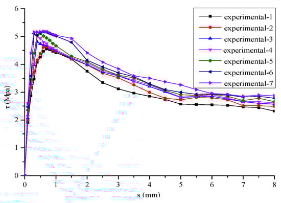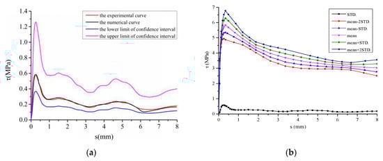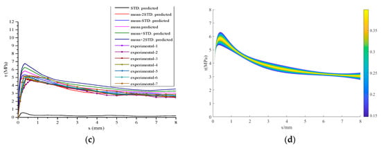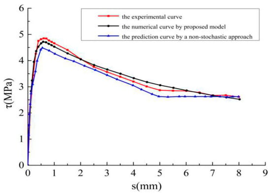 A comparison between the predicted mean τ–ѕ curve by using the proposed model and a non-stochastic model obtained by literature [] is listed in Figure 11. The observation shows that the predicted τ–s curve generated by proposed model was closer to the experimental results, while an underestimation of the stress in most load region is found from the prediction obtained by the non-stochastic model. Additionally, by considering a lack of the capability of characterizing the stochastic behaviors (variance), the applicability of the proposed model is more widely to some extent compared with the non-stochastic model mentioned in this work.
