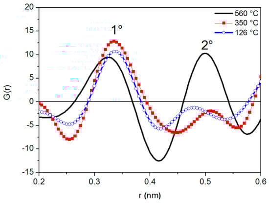 The half width of the first RDF peak at 126 °C is a little wider than that recorded at a close temperature (140 °C) by Gudowski et al. [45] through neutron diffraction. Such discrepancy can be explained by considering the inherent characteristics of neutron and X-rays diffraction [46]: Neutrons exhibit a greater resolution in polyatomic systems because they are scattered by the nuclei; namely, there is essentially point scattering, and the scattering amplitudes do not vary with angle.