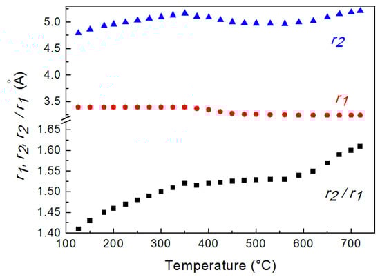 Average distances r1 and r2 of 1st and 2nd nearest neighbors determined from G(r) at different temperature and their ratio r2/r1. The scale is enlarged in the lower part of the graph to evidence r2/r1 variations.