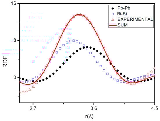 Figure 6 displays the distance between Pb–Pb, Bi–Bi and Pb–Bi pairs vs. temperature. At the eutectic temperature, solid LBE consists of two phases, Bi and the hexagonal β phase (cell parameters a = 0.35058 nm, c = 0.57959 nm) that has a Bi content of 41.8 at %. The distance between the next neighbors in the β phase is a ~0.35 nm and substantially corresponds to that of Pb–Pb pairs just after melting. In fact, Pb is present only in the β phase, and the distance of Pb–Pb pairs in the melt is close to that of atoms in the solid. The Pb–Pb distance slightly decreases up to 350 °C; then, a remarkable drop is observed in the range 350–520 °C, while above 520 °C its value is nearly constant (~0.29 nm). On the contrary, Pb–Bi and Bi–Bi distances substantially do not change with temperature. Therefore, the variations of r1 displayed in Figure 3 depends on the bonds between Pb atoms in the melt and on the change of the distance of Pb–Pb pairs.