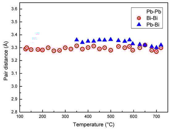Distance between Pb–Pb, Bi–Bi and Pb–Bi pairs vs. temperature.