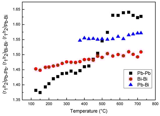 Ratios r2/r1 of Bi–Bi, Pb–Pb and Pb–Bi pairs vs. temperature.