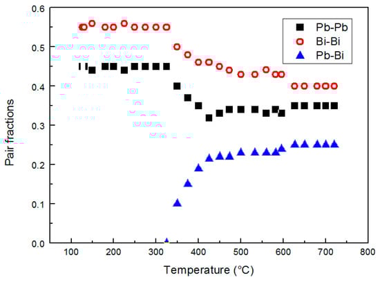 The Pb–Bi pairs are absent from the melting point to 350 °C; then, their contribution becomes increasingly important with temperature (Figure 8).