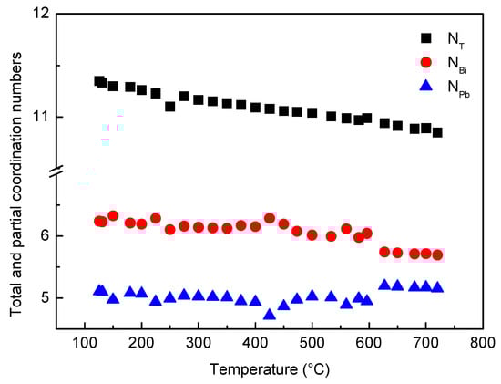 Total (NT) and partial coordination numbers of Bi (NBi) and Pb (NPb) vs. temperature.