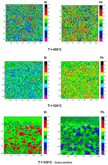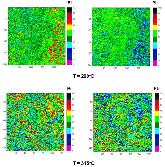 SPEM is a very surface sensitive microscopy, which permits to observe the chemical distribution of the elements at high lateral resolution (~100 nm). To study the micro-chemical distribution, SPEM measurements were performed by collecting maps of the surface area (100 µm ×100 µm) on quenched samples. These maps (Figure 10) are composed of 128 × 128 or 256 × 256 pixels, where each pixel is the intensity of the selected photoemission signal (Pb 4f7/2 and Bi 4f7/2), mediated on 48-channels [54]. Since the photoemission signal depends on the sample height, i.e., the distance between the sample and analyser input lens, the chemical maps of SPEM can be influenced by sample roughness [54]. These topography effects have been eliminated from the chemical maps by using (peak–background)/background routine of Igor software. The local concentration of the elements in the maps is described by the colour scale on the right in Figure 10.