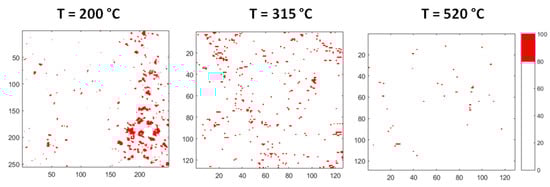 Figure 11 displays the evolution of the areas rich in Bi. The images are obtained from corresponding maps of Figure 10 by plotting in red colour only the zones, where Bi content is in the range of 80–100 at %. It is observed that the aggregates rich in Bi dissolve as temperature increases: At 315 °C only a few small areas remain, and the process is substantially completed at 520 °C.