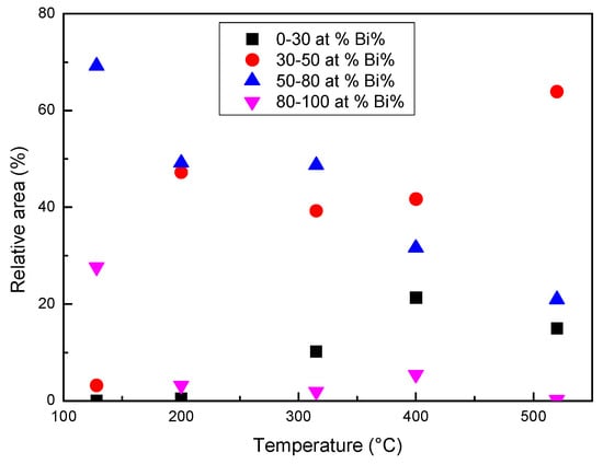When the temperature reaches or exceeds 315 °C, a diffused interface is observed between the zones with different composition or at least it is not possible to identify specific interfaces with the lateral resolution of the images in Figure 10, where each pixel represents the mean elemental content of 0.8 × 0.8 or 0.4 × 0.4 μm2. In order to describe the process of homogenization, the relative areas of the pixels with Bi content in four different ranges (at %) have been plotted vs. temperature in Figure 12. The ranges of 80–100 and 30–50 at % represent the Bi-rich zones, which progressively dissolve, and the areas with a composition tending to the average one, which is about 70% at 520 °C.
