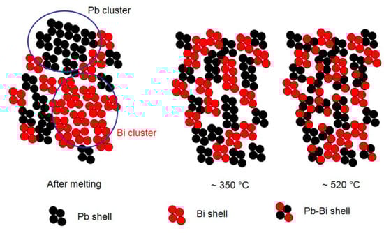 SPEM maps confirm the results of HT-XRD and provide additional information on the processes occurring in liquid LBE on an atomic and micro-scale. From melting point to 350 °C, the atoms of the same species tend to be bound together (Pb–Bi pairs are not present) and at the lowest temperature they form clusters, which progressively dissolve as temperature increases and only a few residuals remain at 315 °C (Figure 11 and Figure 12). When the temperature exceeds 350 °C, a process of homogenization also starts on an atomic scale: The fraction of Pb–Bi pairs increases at the expense of the Bi–Bi and Pb–Pb ones and the clusters break up and completely disappear at 520 °C. The behavior of liquid LBE suggests that homogenization on a micro-scale is the condition for a general re-arrangement on an atomic scale leading to the formation of Pb–Bi pairs.