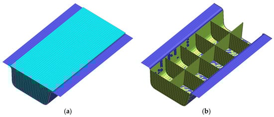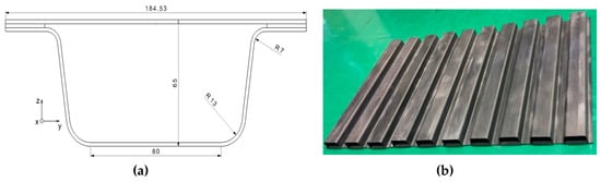 The rocker panel of one electric vehicle was selected to be redesigned in the unidirectional carbon fiber composite material. The component section with a thickness different from that of the steel version is shown in Figure 2a. It was composed of two parts, a flat plate and a beam with a bowl profile section, which were connected by structural adhesive. Their stacking sequence was −45/45/0/0/0/45/−45 with a wall thickness of 2 mm. The whole component was 1200 mm in length.