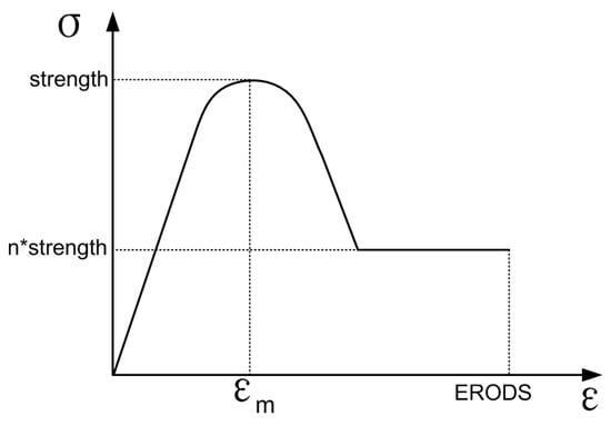 The LS-DYNA MAT58 material model (*MAT_LAMINATED_COMPOSITE_FABRIC) was selected for modeling this unidirectional carbon fiber composite material. It assumes a nonlinear pre-peak and post-peak response, and the slope of the pre-and post-peak response can be changed via parameter εm (εm = E11T, E11C, E22T, E22C, GMS). εm is the corresponding strain at strength. This continuum damage mechanics model provided a smooth increase in the stress to strength and then a smooth decrease to the stress decided by scale factor n (n = SLIMT1, SLIMC1, SLIMT2, SLIMC2, and SLIMS). The typical stress–strain curve for this material model is schematically shown in Figure 4.