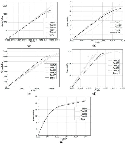 Comparison between test and simulation at the coupon level. (a) 0° tension. (b) 90° tension. (c) 0° compression. (d) 90° compression. (e) Shear.