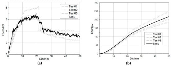Comparison between test and simulation at the component level. (a) Force–displacement curve. (b) Energy absorption–displacement curve