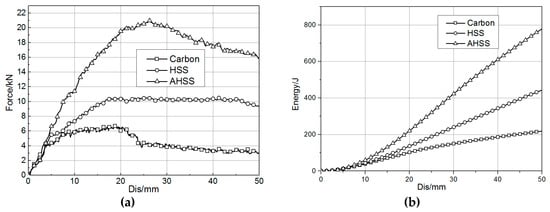 The simulation results are shown in Figure 7. The reacting force of the steel rocker panel component was higher than that of the carbon fiber component from the beginning of deformation to the end. The peak reacting force values for carbon fiber, HSS, and AHSS were 6.82 kN, 10.54 kN, and 20.98 kN, respectively. The energy absorption values during crushing for those three materials were 218.69 J, 443.09 J, and 778.42 J, respectively. Therefore, unless the wall thickness is greatly increased, this kind of carbon fiber material cannot achieve bending performance as good as that of the steel material, although its tensile stress in the longitudinal direction was 1763 MPa.