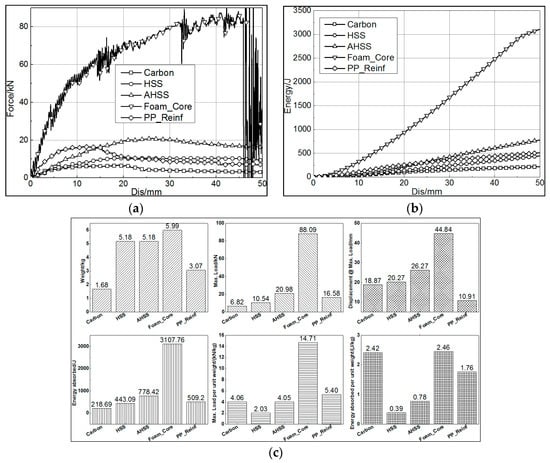 The reinforced FE models experienced the same loading conditions as the carbon and steel component models. The simulation results are shown in Figure 10. Six parameters were acquired from the simulation results: component weight, maximum load, related displacement when reaching maximum load, energy absorption when the displacement of the impactor reached 50 mm, maximum load per unit weight of component, and energy absorption per unit weight of component. All of these results are shown in Figure 10c.