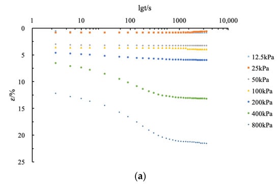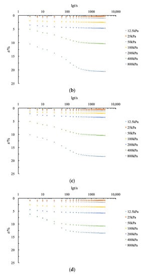 It can be seen from Figure 14 that the relationship between the deformation rate and time showed a nonlinear deformation characteristic. As the load increased, the nonlinear deformation characteristics of the sample increased. At the same time and under the same load, with the addition of fly ash, its deformation decreased with the increase of fly ash content. Within the first 100 s of each stage of pressure application, the deformation was not large and the sample had no significant vertical deformation. However, from 400 kPa load on, the deformation increased speedily from 100 s and tended to be stable after 1000 s. The vertical deformation rate remained basically unchanged.