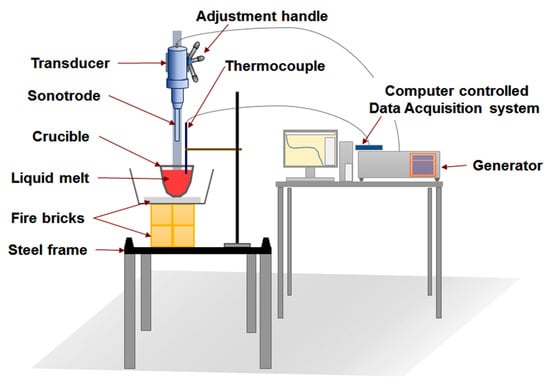Ultrasonic treatment (UST) platform (steel frame) shows the arrangement of a crucible containing liquid melt placed over fire bricks. The adjustable handle is used to lower the sonotrode into the melt when the required temperature is recorded by the data acquisition system (K-type thermocouple).