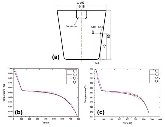 (a) Schematic of the casting setup with two thermocouples for the validation of the model and the corresponding cooling curves in (b) as-cast condition without UST and (c) after UST [38].