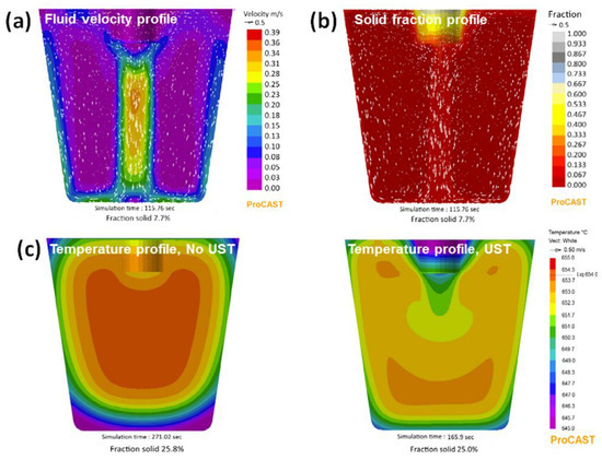 Simulations of (a) Fluid velocity and (b) solid fraction during UST, and (c) temperature gradient before and after UST in Al–2Cu alloy [38].