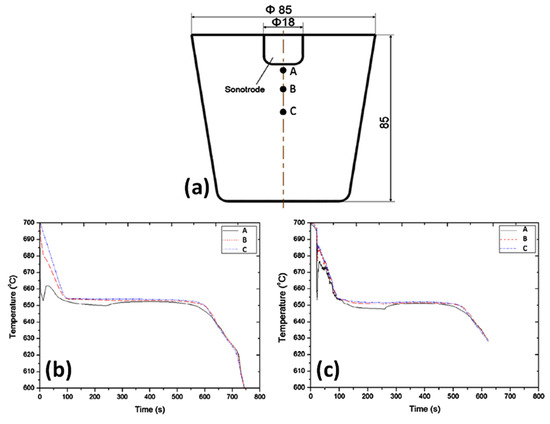 (a) Schematic of the casting setup shows the locations of points (A, B, C) and the simulated cooling curves of an Al-2Cu alloy when (b) the sonotrode is immersed into the melt but is not turned on during solidification and (c) the sonotrode is turned on before immersion into the melt and remains on during solidification as detailed in [38].