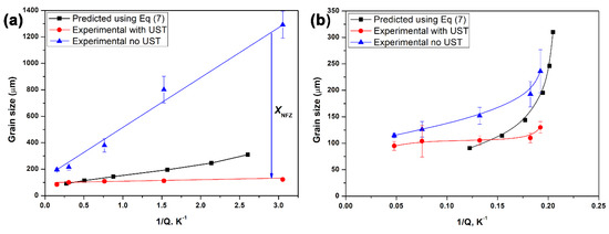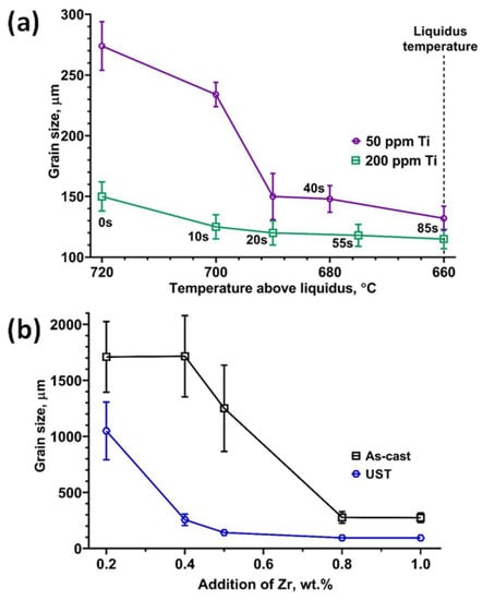 UST terminated above liquidus temperature at specific temperatures from 720 °C to 660 °C in (a) Al3Ti1B master alloy added at 50 and 200 ppm to pure Al and (b) Mg-25Zr master alloy added to commercial purity Mg. The liquidus temperature in Mg-Zr alloys varies from 651 °C to 653 °C in which UST is applied from 750 °C to 660 °C for 60 to 90 s.