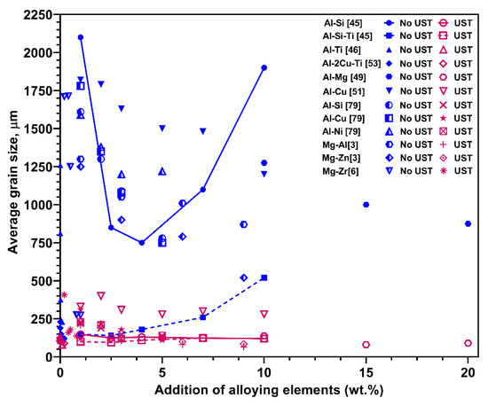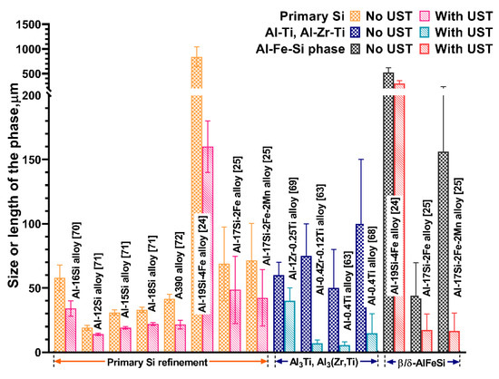 Refinement of primary intermetallic phases after UST reported for selected Al alloys.