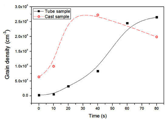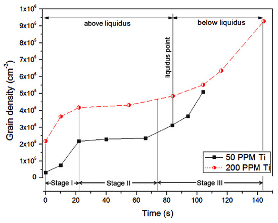 The grain refinement produced by UST when applied in the liquid melt or terminated just above the liquidus temperature mainly depends on the heterogeneous particles. For example, potent particles like TiB2 and Zr produce excellent refinement compared to oxide substrates [6,44,46,47]. On the other hand, when the UST temperature range is extended to below the liquidus temperature, the refinement is enhanced to a greater extent even without potent particles or at reduced amounts of inoculant addition. Figure 8 shows that the grain density is remarkably increased when UST is applied below the liquidus temperature in Al containing TiB2 particles and the difference in refinement with respect to the amount of Al3Ti1B master alloy (50, 200 ppm) is almost insignificant. In other words, the amount of grain refinement obtained with 200 ppm could be readily obtained with 50 ppm of Ti when UST continues to be applied below the liquidus temperature for 100 s. It is interesting to note that the grain density increases rapidly until 20 s and reaches a steady state condition until 80 s. This implies that for a given addition amount of refiner, there is a limit to the number density of the particles that can be activated, in which a further activation is possible by extending the UST temperature range to below the liquidus temperature. This is also observed in a Mg-0.2Zr alloy in which a 63% grain size reduction after terminating UST above liquidus temperature has been further increased to 85% when UST is extended below the liquidus temperature for 2 min. This is a significant advantage of UST where the refiner addition can be reduced without compromising the percentage of refinement obtained [6].