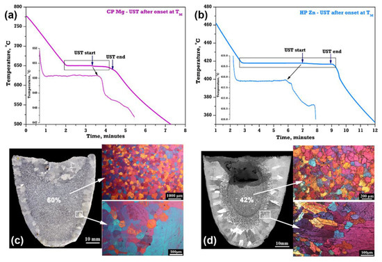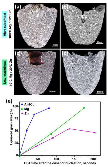 Macrostructures after UST was applied during solidification at (a,b) high and (c,d) low superheat (temperature at which UST is turned on above the melting temperature) in (a,c) pure Mg and (b,d) pure Zn [43,44]. (e) Equiaxed grain area measured from the cross section of the casting with respect to UST time after the onset of solidification [43,44,76].