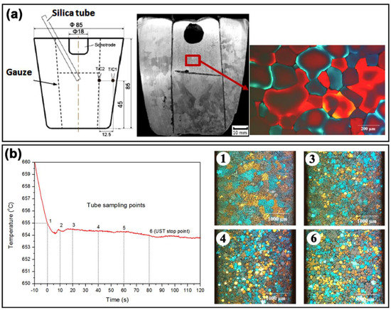 Solidified samples with and without UST were sectioned vertically to analyse the macrostructure and small samples of (15 mm × 10 mm) were taken to analyse the microstructural refinement. After polishing the samples using the standard metallographic preparation methods and etching, microstructures were examined in a polarised light microscope (Leica Polyvar). The grain size measurements were calculated using the linear intercept method by image analysis software [6,43]. The specific procedures of the composition analysis, sampling regions, etchants and etching techniques used for individual alloy systems can be found in the respective references listed in Table 1.