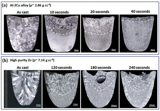 When UST is applied until complete solidification, the whole ingot structure is refined as shown in Figure 9c. As already described in Figure 10b increasing the time gradually increases the number of non-dendritic grains. Figure 11 shows the effect of such grains settling towards the bottom of the crucible when UST is terminated before complete solidification. After the grains are generated in the cavitation zone, the acoustic stream carries these grains to the bottom of the casting [43,76]. Low temperature gradients enhance the survival of a higher number density of grains and it results in the non-dendritic equiaxed zone. Termination of UST at shorter times results in two types of grains above the equiaxed zone (i) rosette or mixed dendritic grains just above the equiaxed layer and (ii) large columnar grains at the top surface of the casting influenced by the radiation heat transfer [76]. Based on the thermal conductivity of the metal, the action of grains filling the macrostructure of the Al-2Cu alloy ingot (Figure 11a) is faster (80 s) than that of pure Zn (240 s, Figure 11b). Furthermore, it is interesting to note that increasing the time from 20 to 80 s (Al-2Cu alloy) produces completely equiaxed grains throughout the cross section of casting whereas in Zn increasing the time duration from 180 s to 240 s results in a similar area of equiaxed zone. Also, the temperature range at which excellent refinement is achieved is 40 °C above the liquidus temperature in Al-2Cu alloy and for Zn it is 20 °C above the melting temperature. This comparison shows that UST produces similar tendencies in grain formation and settling regardless of the type of metal and it only depends on the temperature range of UST.